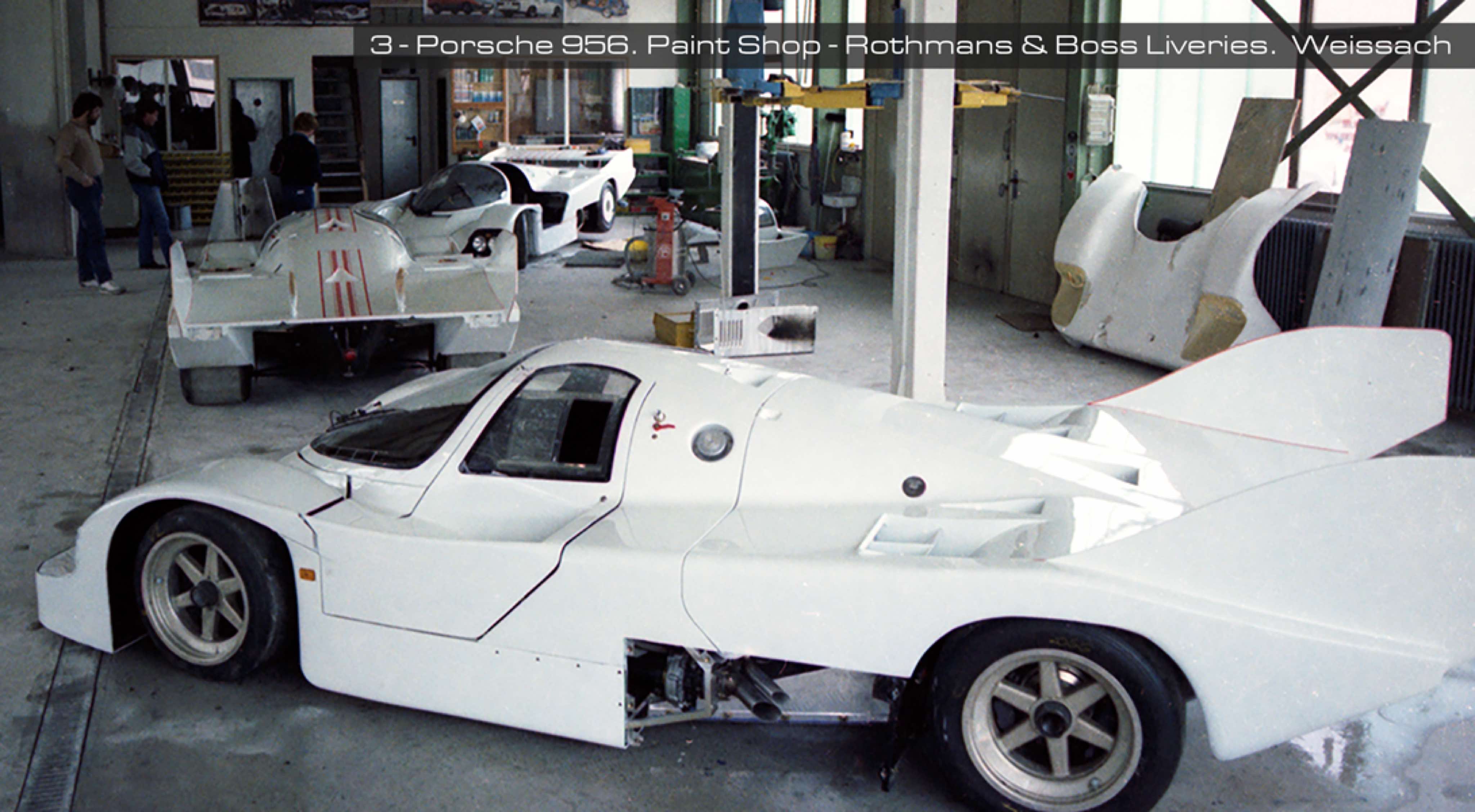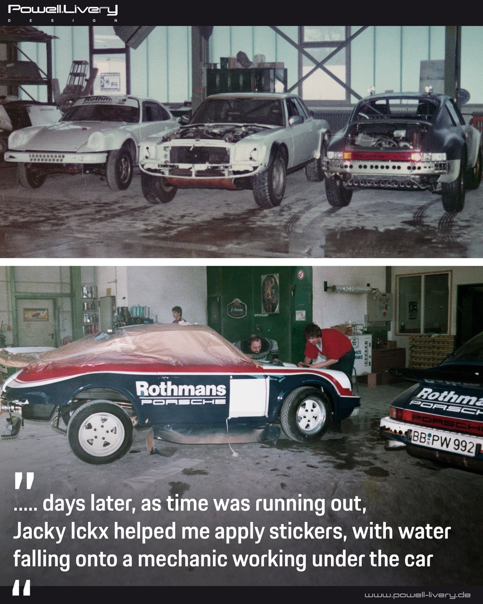 A day or so later, I was in the Porsche workshops, ( a lot cleaner than the paint shop) where all 3 cars were being finished. The third car had just been delivered and I was trying hard to apply the stickers amongst all the action. Time was running out for me and I wanted to get the long Rothmans / Porsche on to the door. Jacky was sitting on a work bench and saw me struggling and came across to offer me help. So with a mechanic working under the car we managed to get it on, with water dripping all over the guy. 🙂